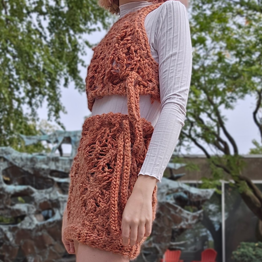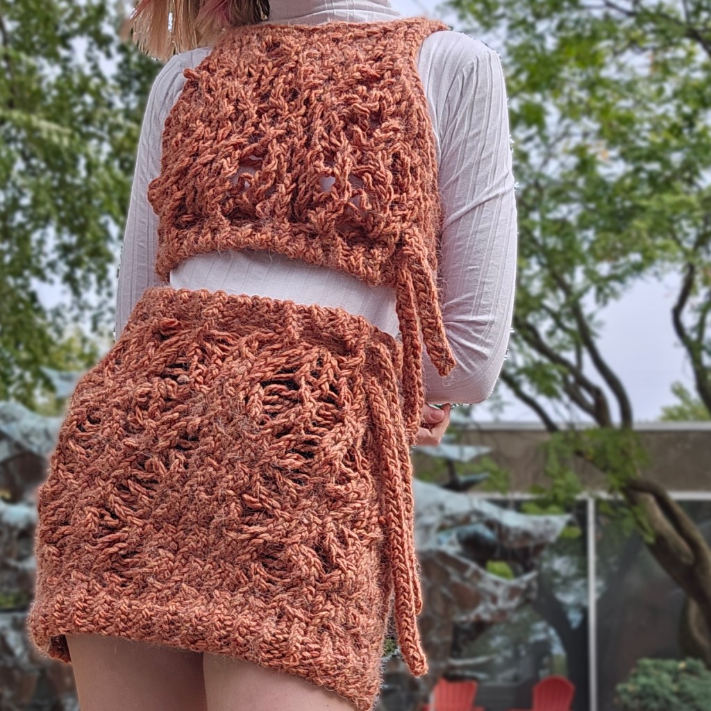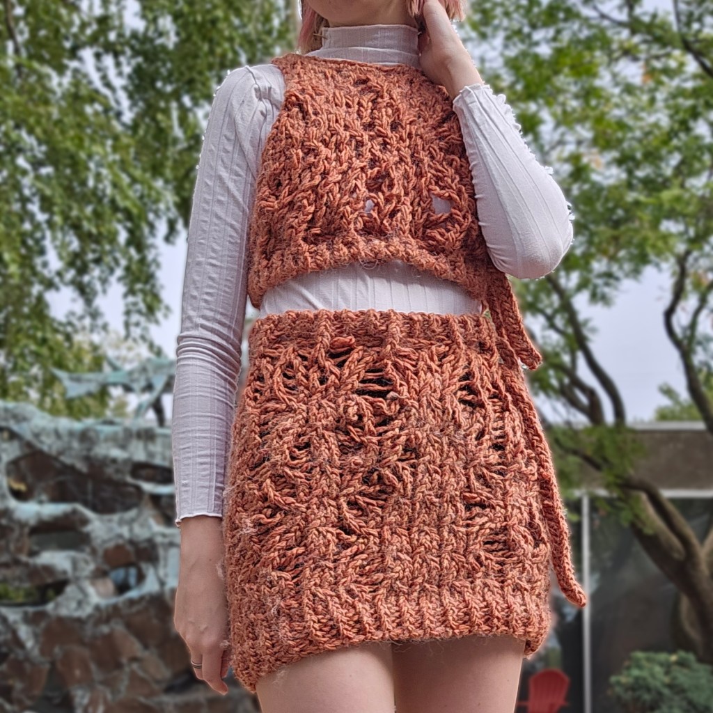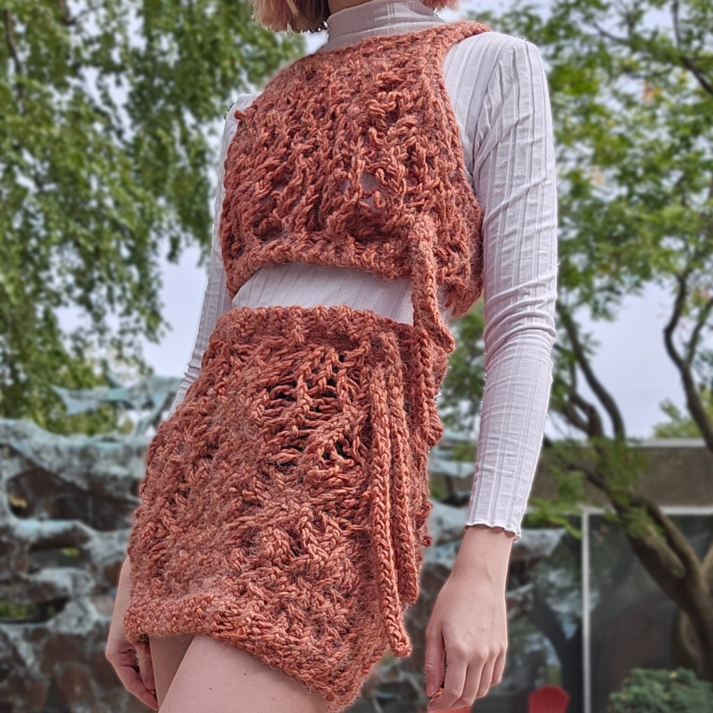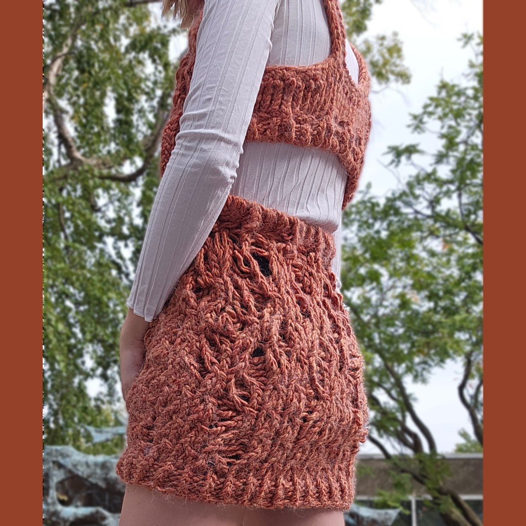Knitted top and skirt with dropped cable stitch