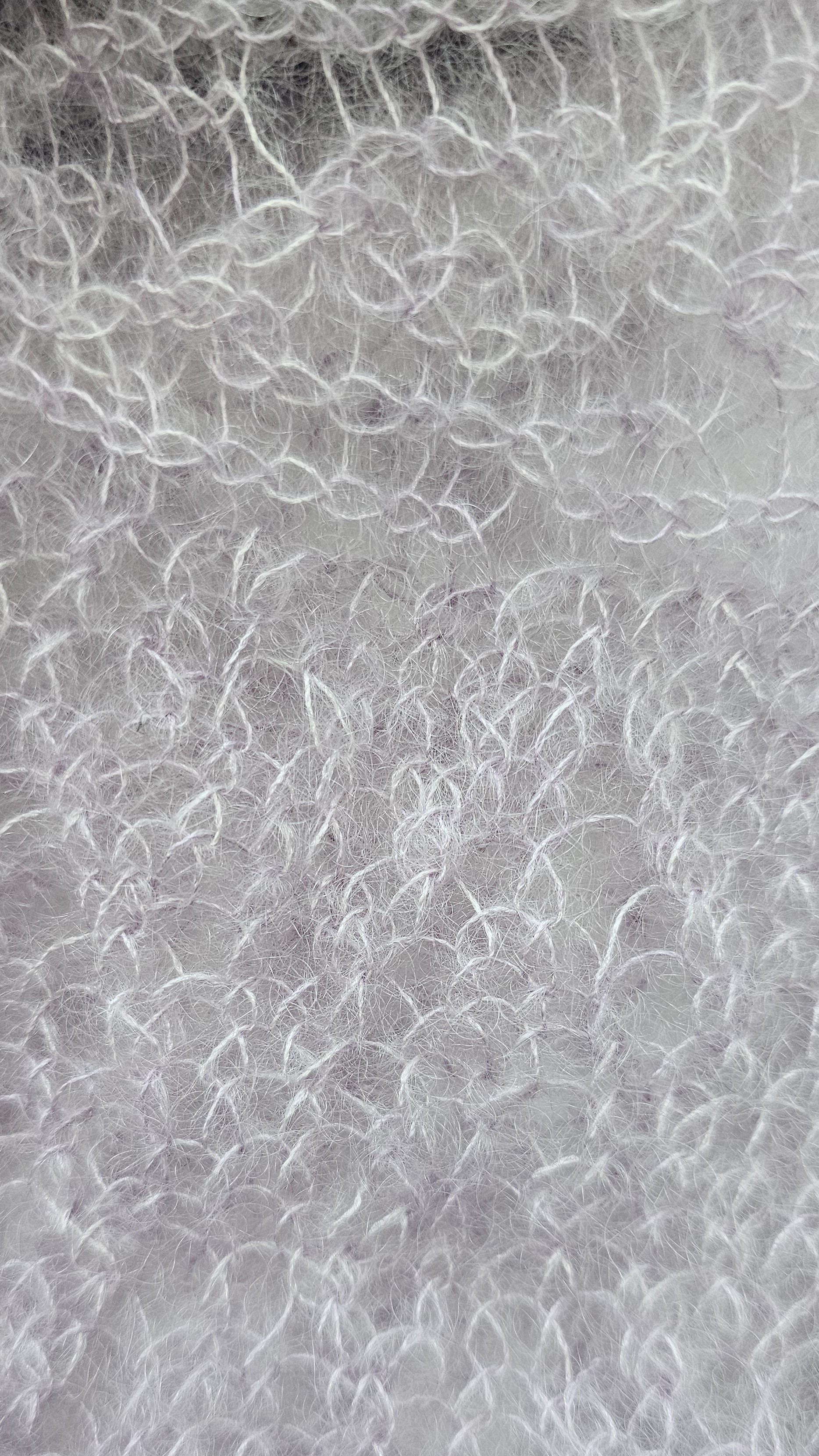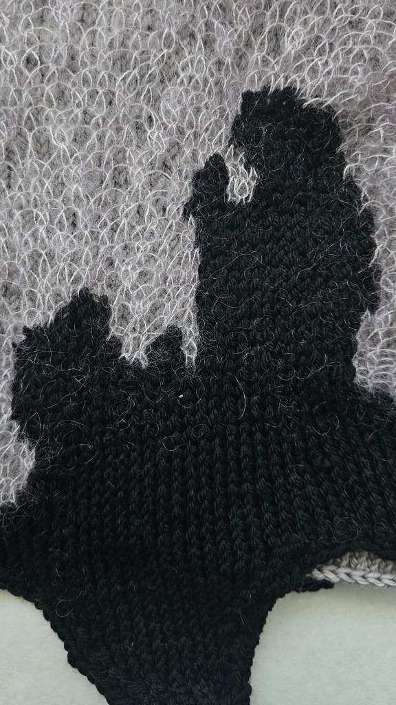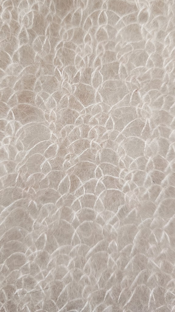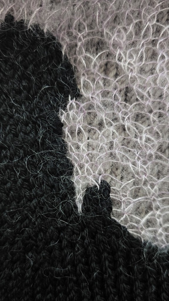 The upper layer is knit with 5.5mm needles and uses both the crawling lace stitch and stockinette