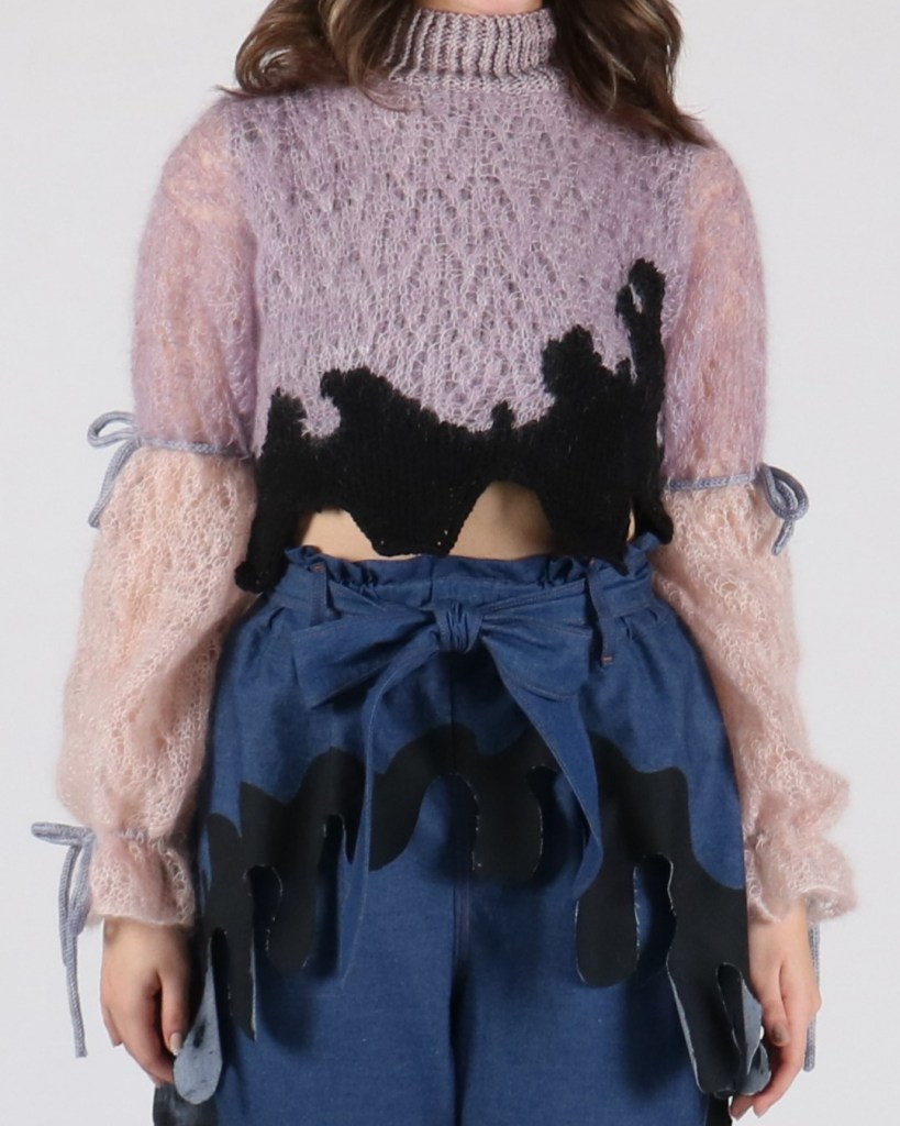 This top is knit using four different stitches and 2 different needle sizes and an i-cord knitting machine for the ties.