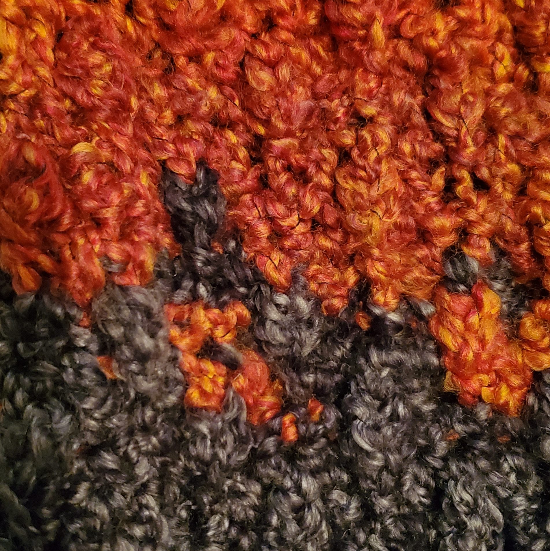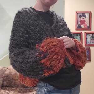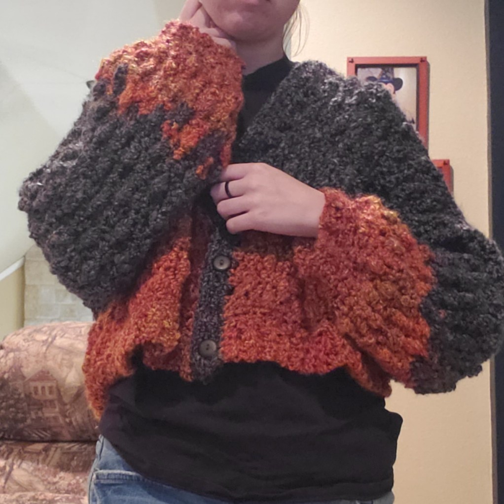 Crocheted free hand cardigan with a fire pattern on the bottom and sleeves